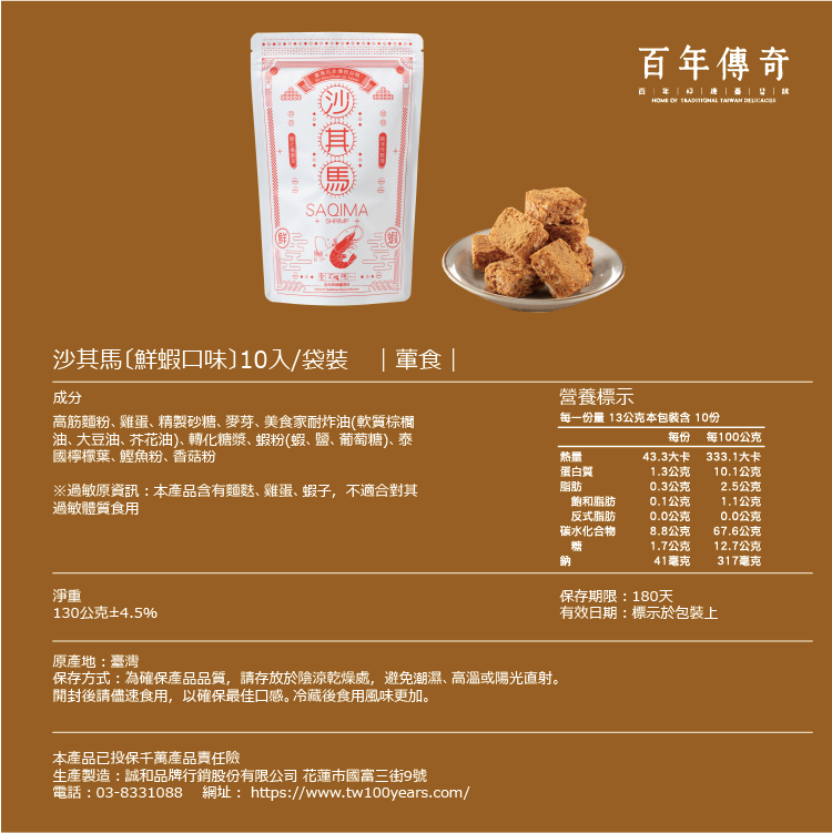 嚴選磷蝦與白蝦混合乾燥研磨,融入沙其馬麵體,帶來自然鮮香與獨特的海味鹹香。低溫發酵製程不添加膨鬆劑與酵母粉,讓沙其馬保持酥脆爽口、層次分明。入口時能感受到蝦香交織麥香,鹹甜平衡,顛覆傳統沙其馬的印象,是適合日常零嘴、聚會分享或下酒小食的特色點心。