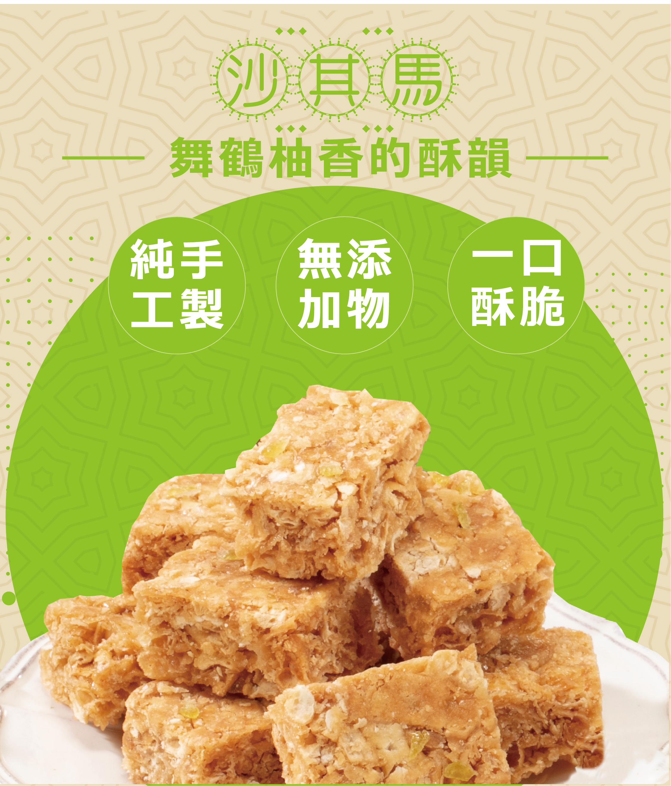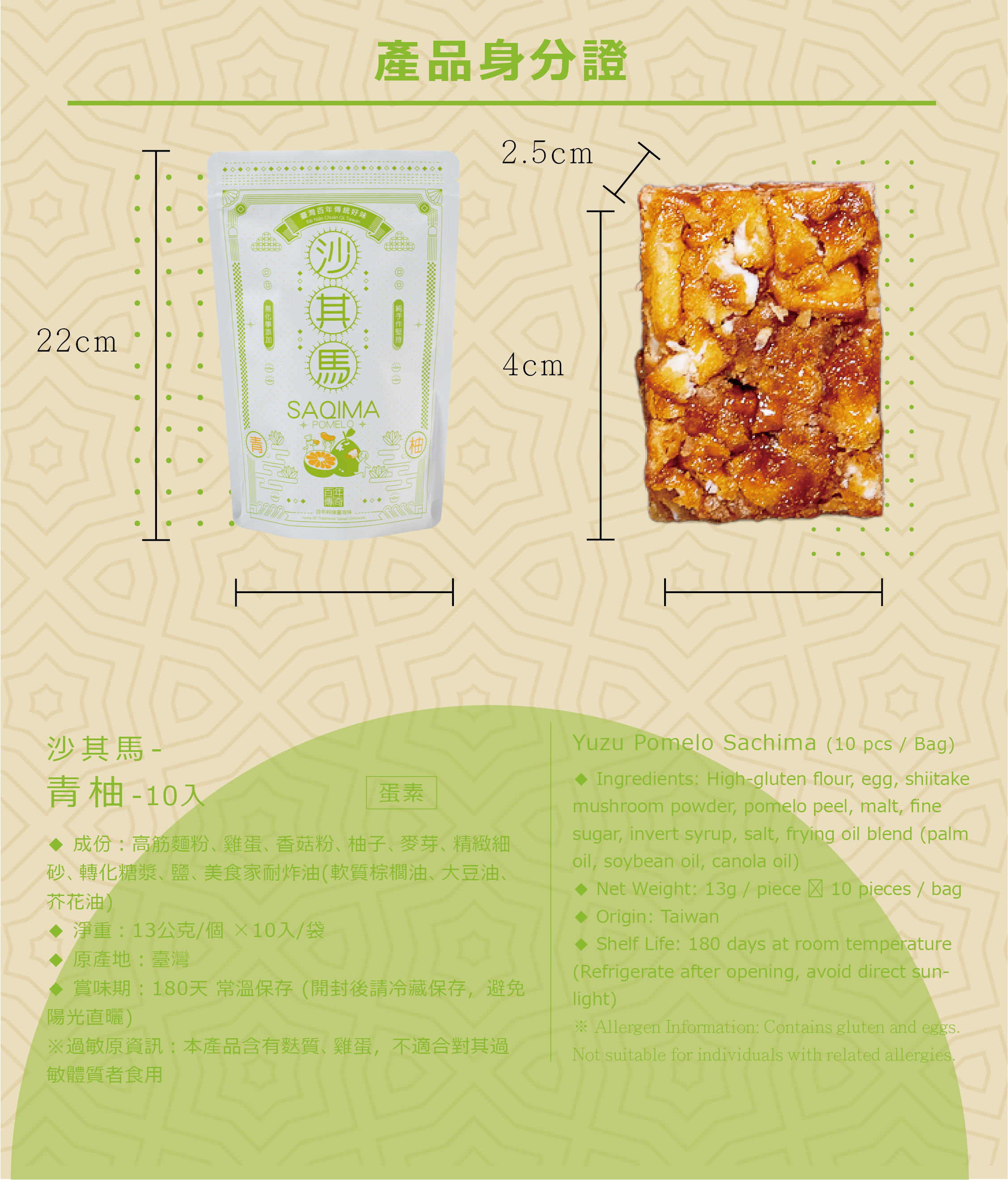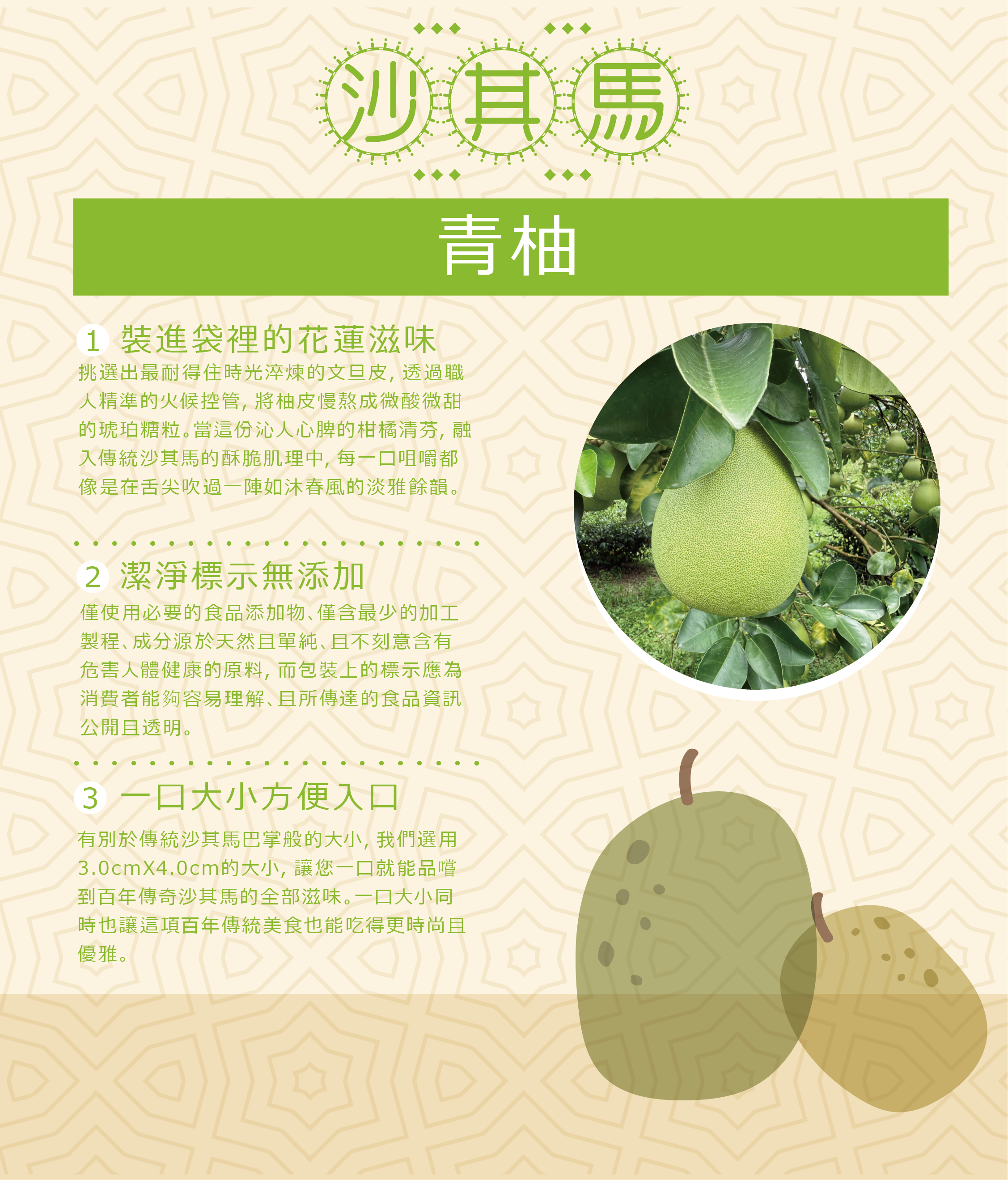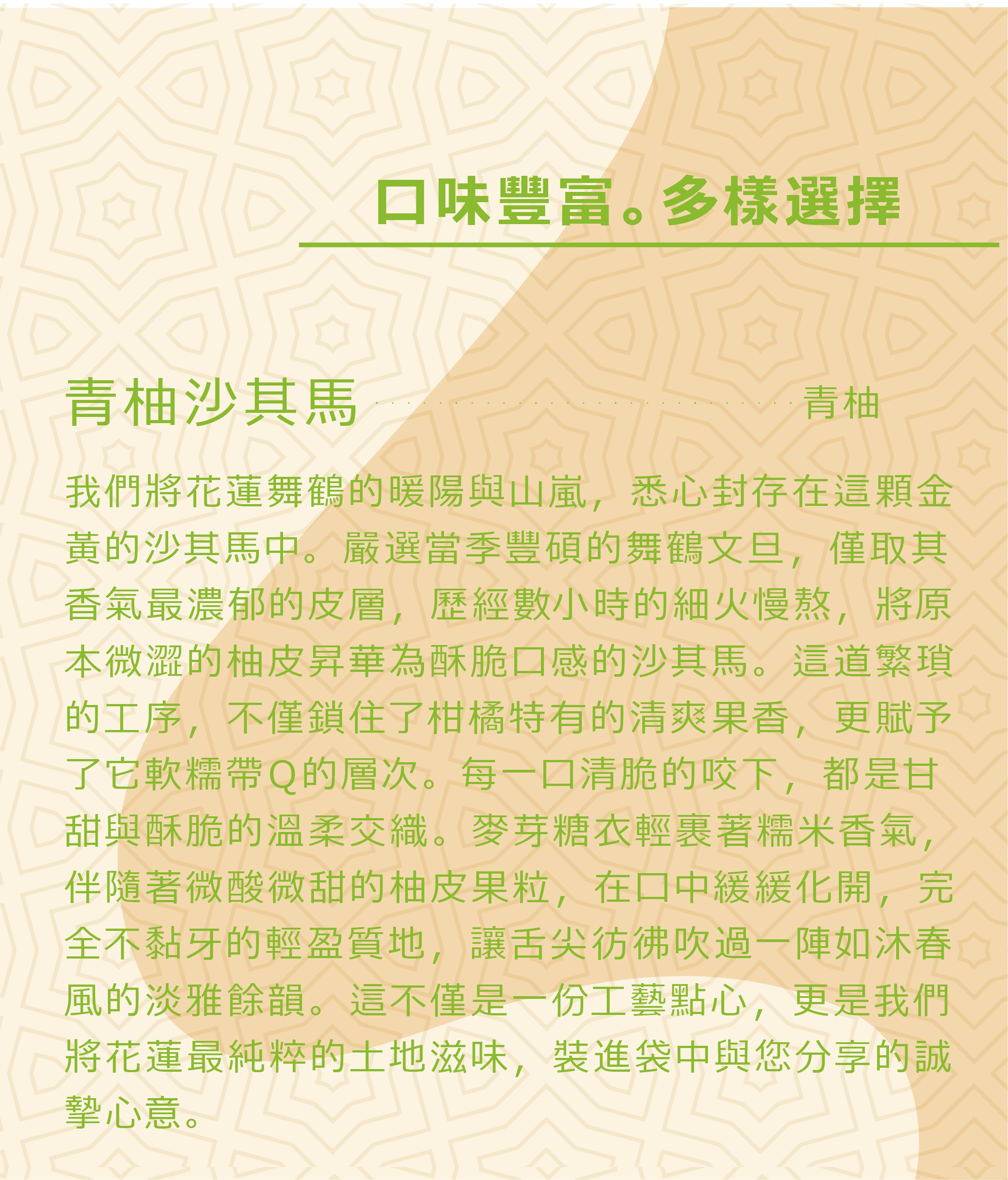 以花蓮舞鶴文旦柚皮糖入味,清香爽口,展現沙其馬全新風貌。與花蓮千萬流量部落客「跳耀的宅男」聯名推出,獨具地方特色與人氣話題。