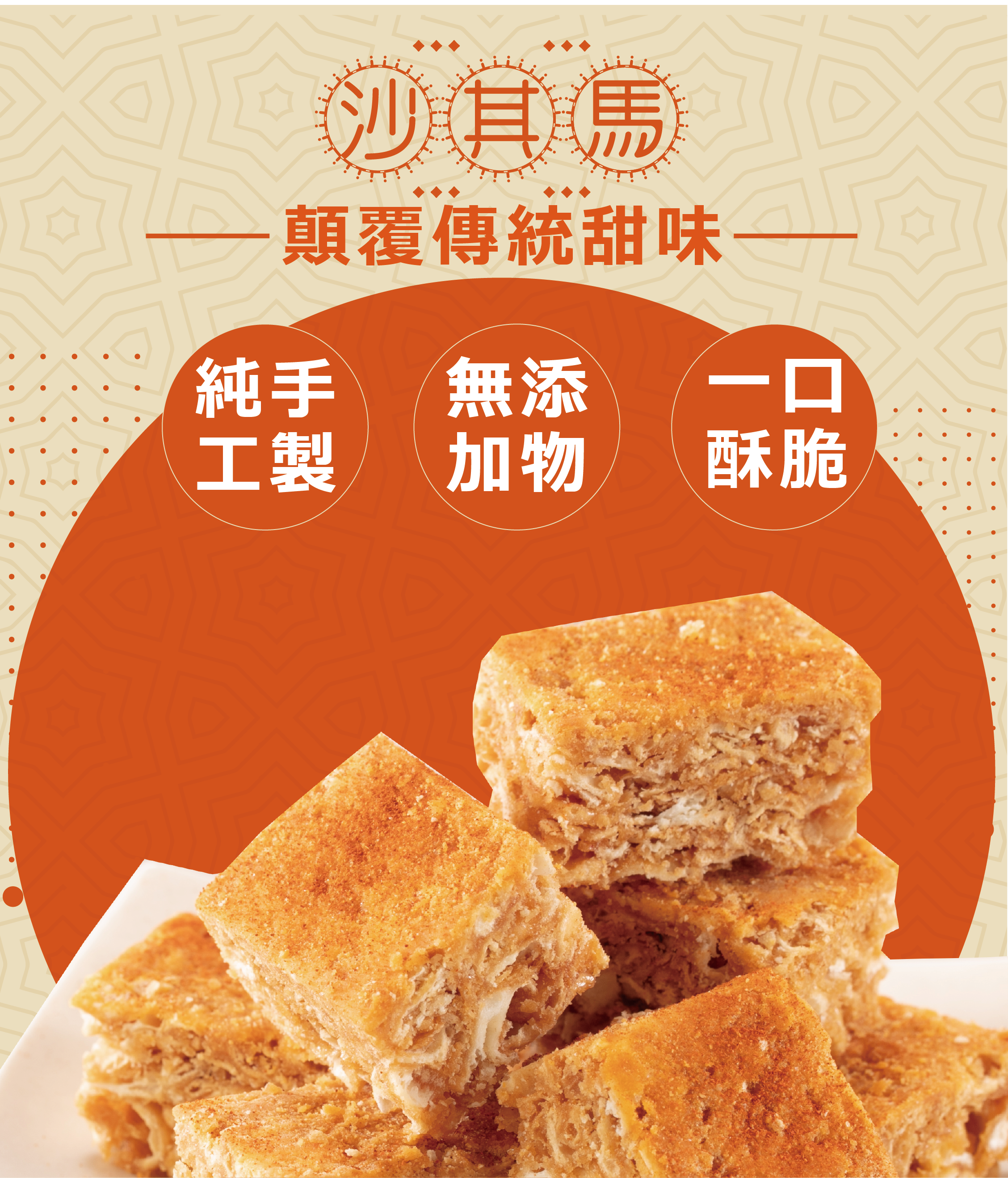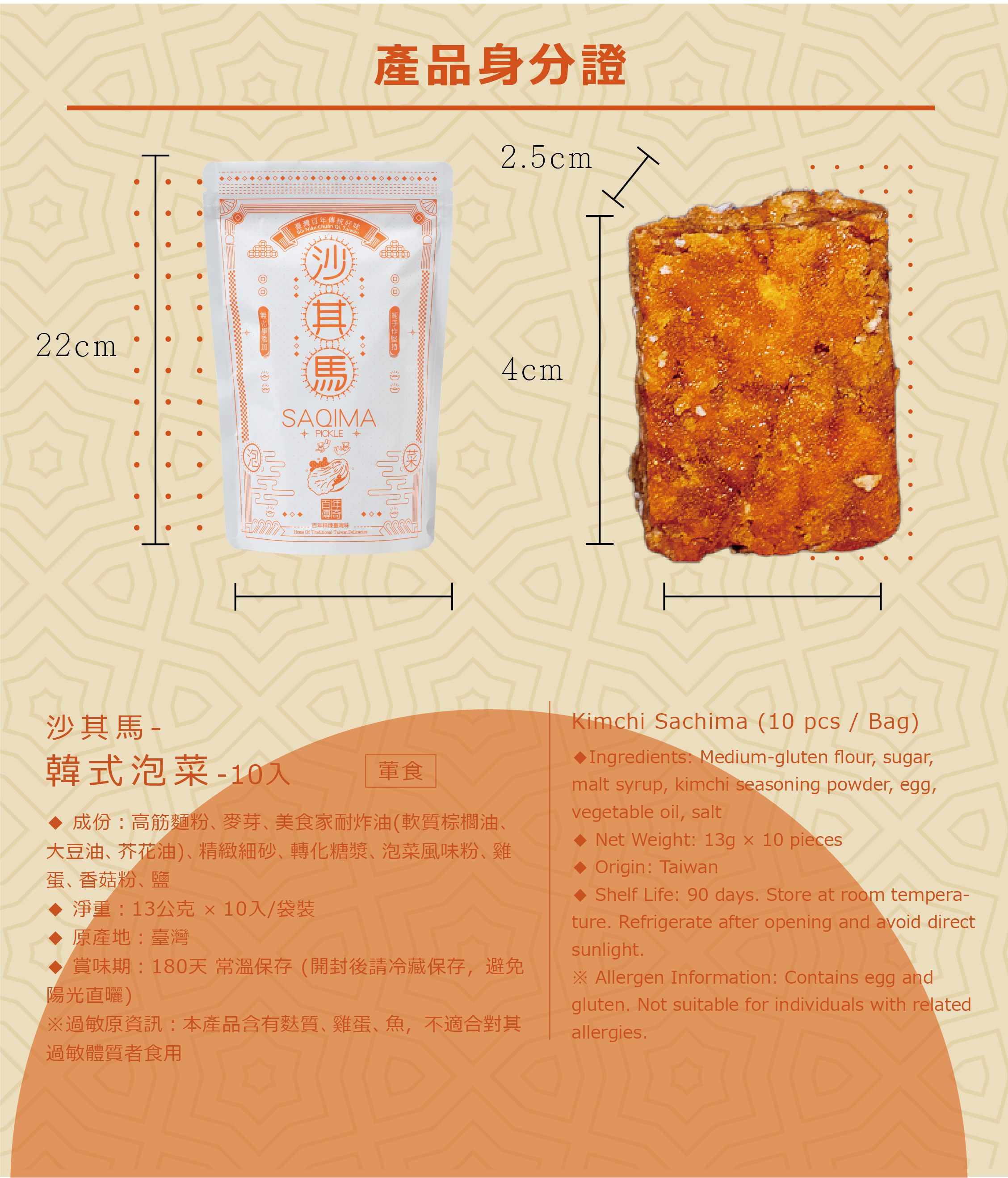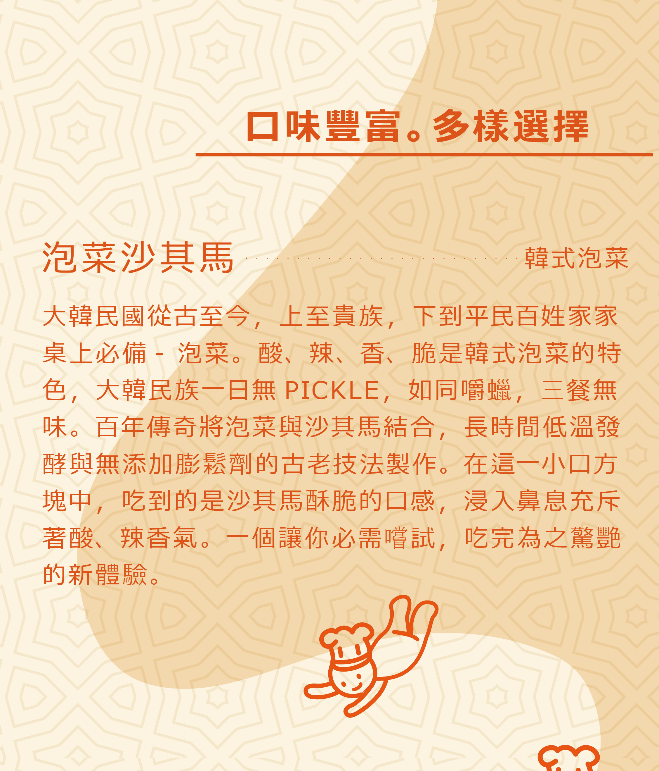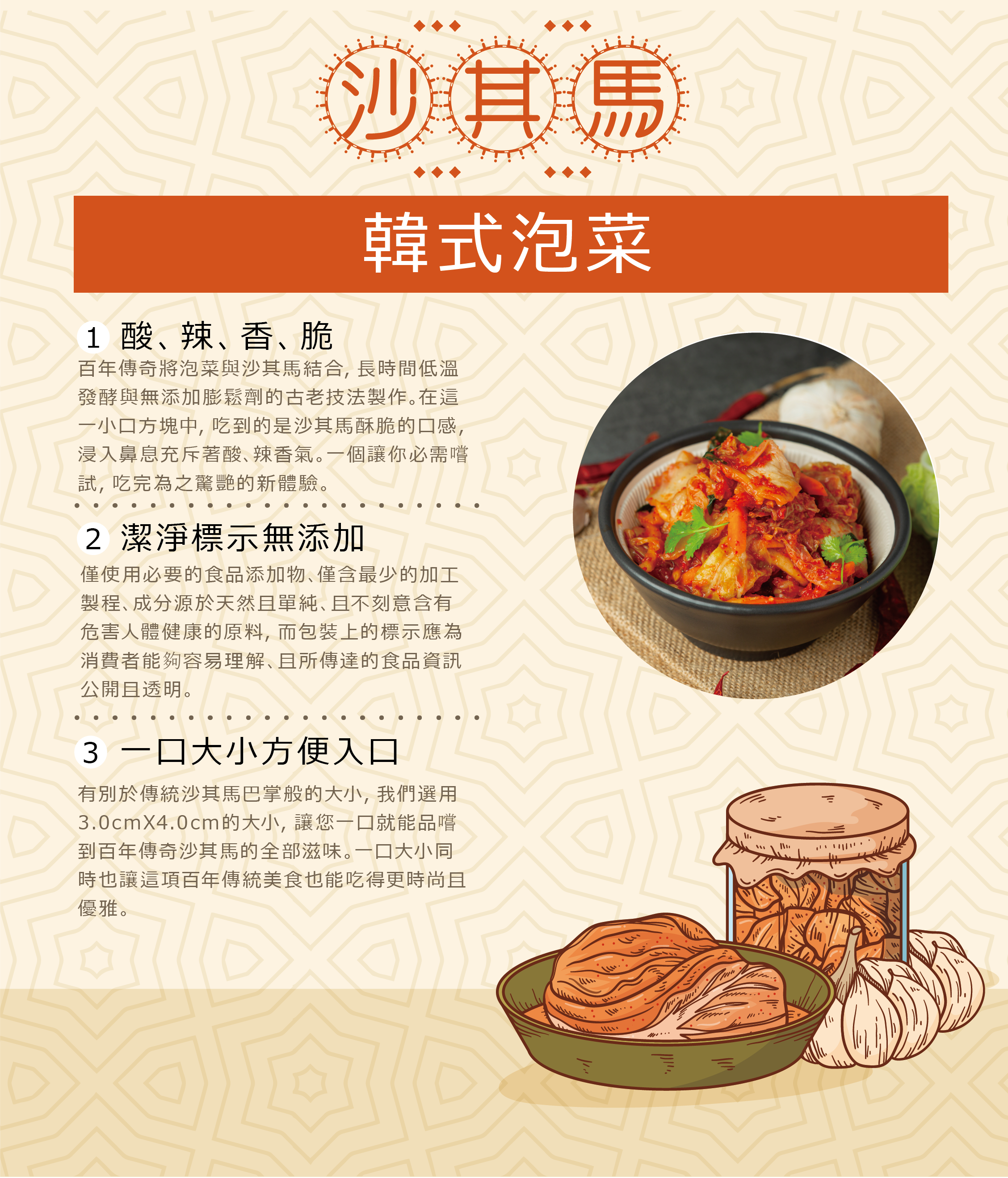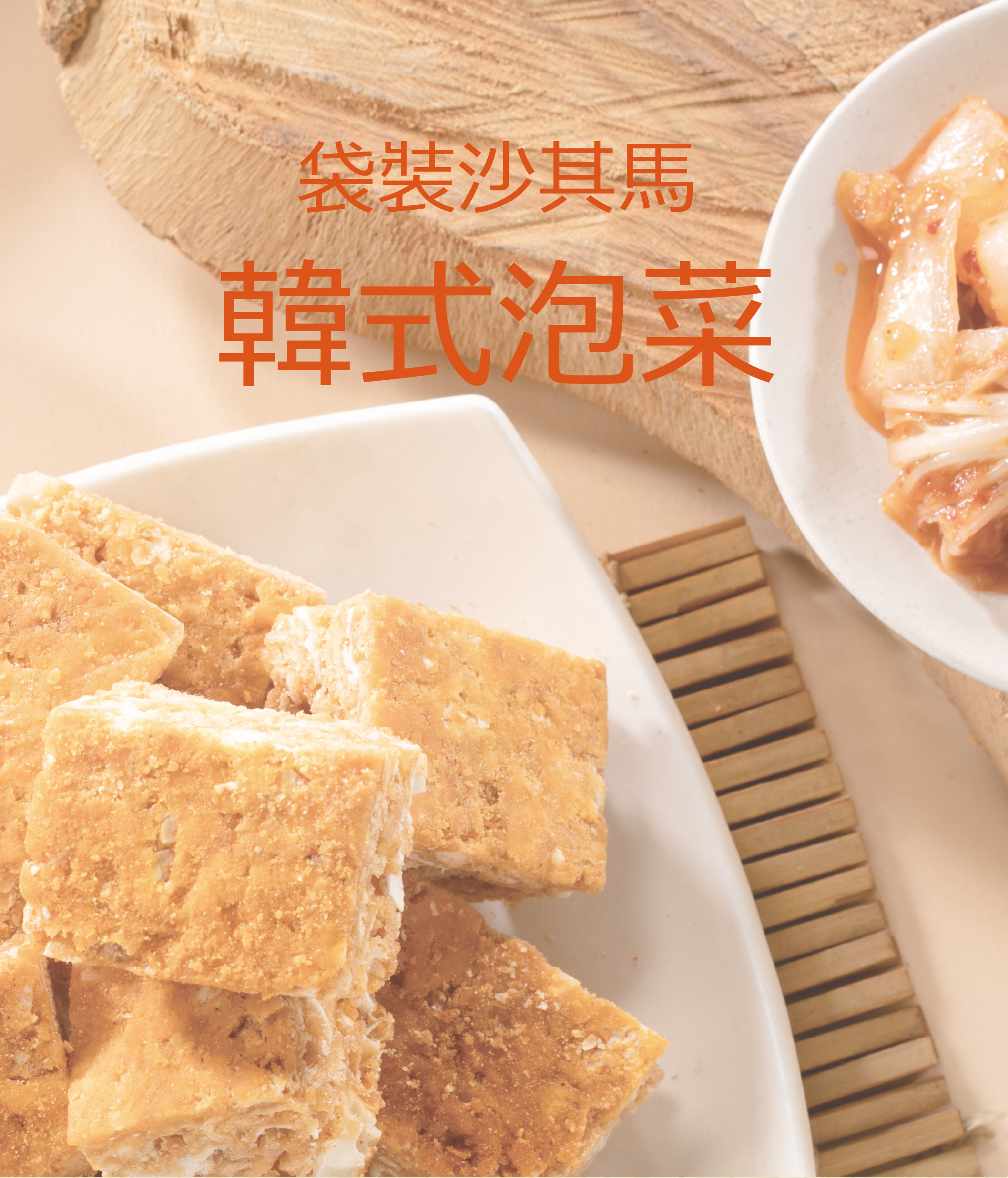 融合韓式泡菜風味,鹹香微辣的創新沙其馬,酥脆爽口,袋裝設計方便分享